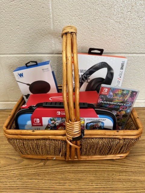Help keep your kid entertained! This basket includes a Nintendo Switch and travel case, Mario Cart game, wireless charger, and noise cancelling headphones for you!