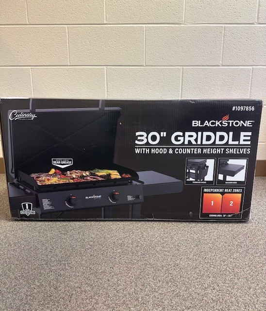 30" Blackstone griddle with two burners, hood, and counter height shelves.