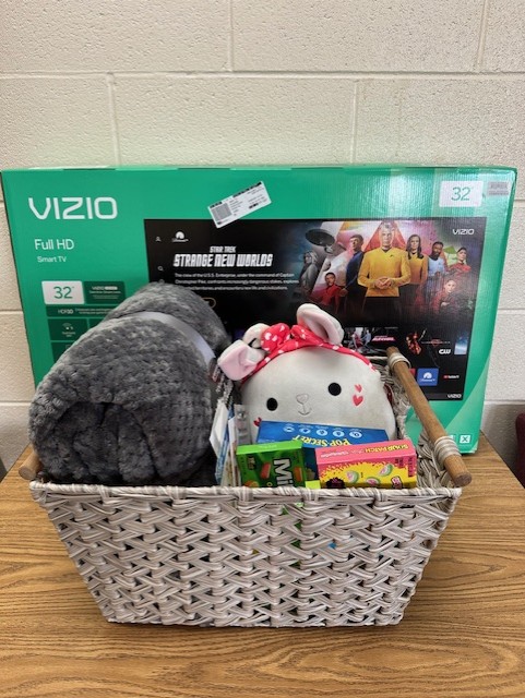 This package includes $25 gift cards to Chipotle and Netflix, a $30 gift card to Coldstone and a 32" TV. Also, for the the kiddos a squishmellow, lush blanket, and popcord/candy.